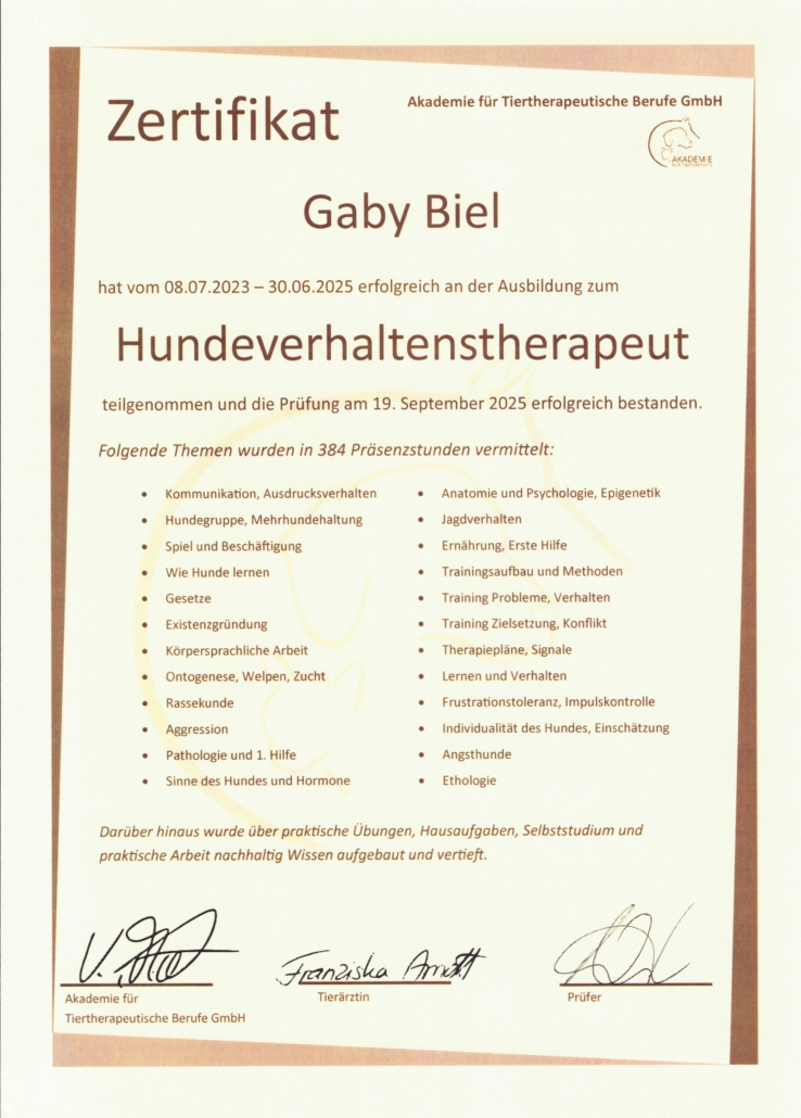 Am 19.09.2025 habe ich eine weitere Ausbildung bei der Akademie für Tiertherapie in Babenhausen zum Hundeverhaltenstherapeuten erfolgreich absolviert. Die Ausbildung ist vom Deutschen Fachverband Tiertherapeutischer Berufe e.V. geprüft und zertifiziert.